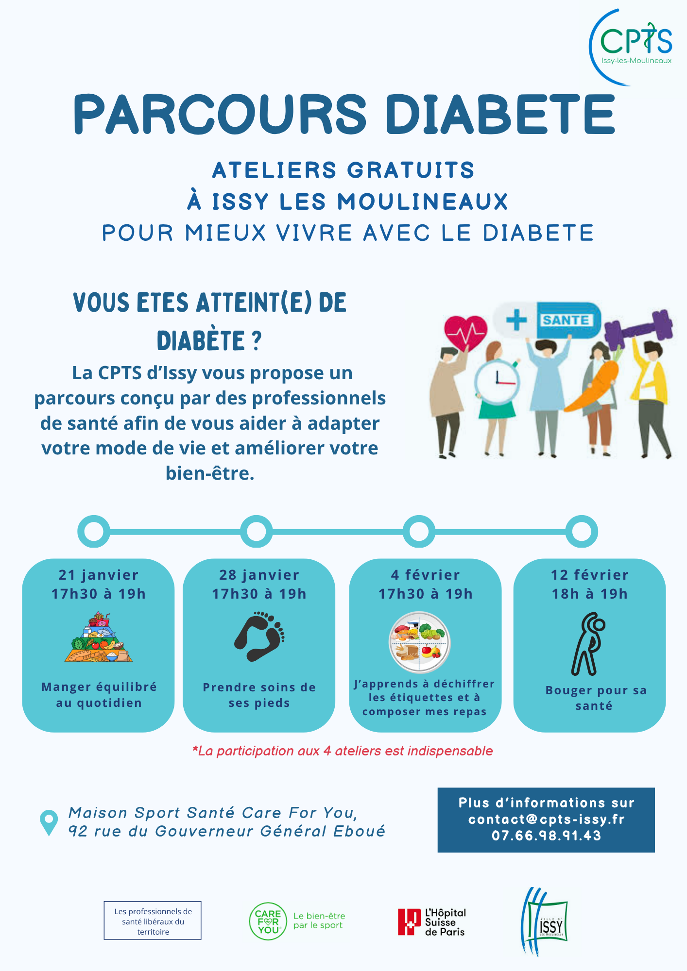 Dans le cadre de l’amélioration du parcours de santé des patients diabétiques, la Communauté Professionnelle Territoriale de Santé (CPTS) en collaboration avec des professionnels de santé libéraux, la Maison Sport Santé du territoire (Care For You) et l’Hôpital Suisse de Paris organise des ateliers thérapeutiques à destination des patients isséens de plus de 18 ans atteints de diabète.